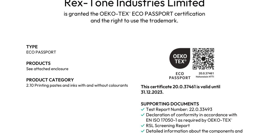 OEKO-TEX Certificate Rex-Tone ( ATinks )